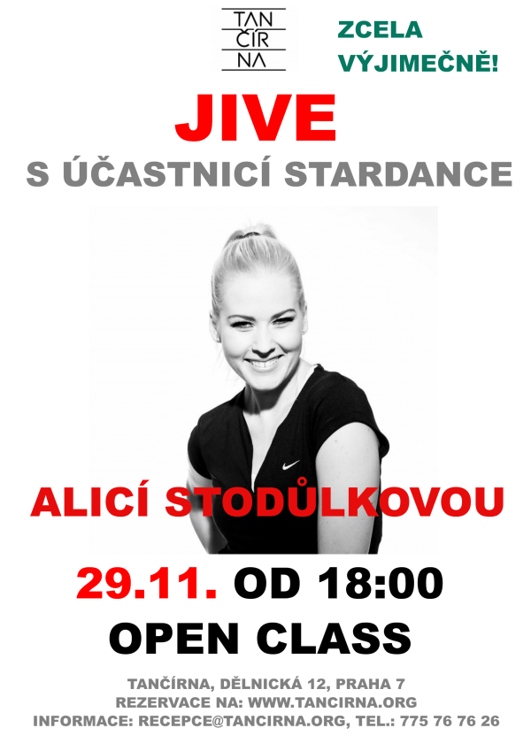 Tančit se bude JIVE. Podrobnosti najdete na letáku nebo na recepci tel. 775 76 76 26. Neváhejte a využijte této výjimečné příležitosti zatančit si s touto skvělou tanečnicí. Online rezervace je možná zde.